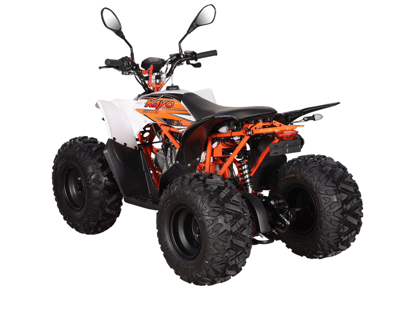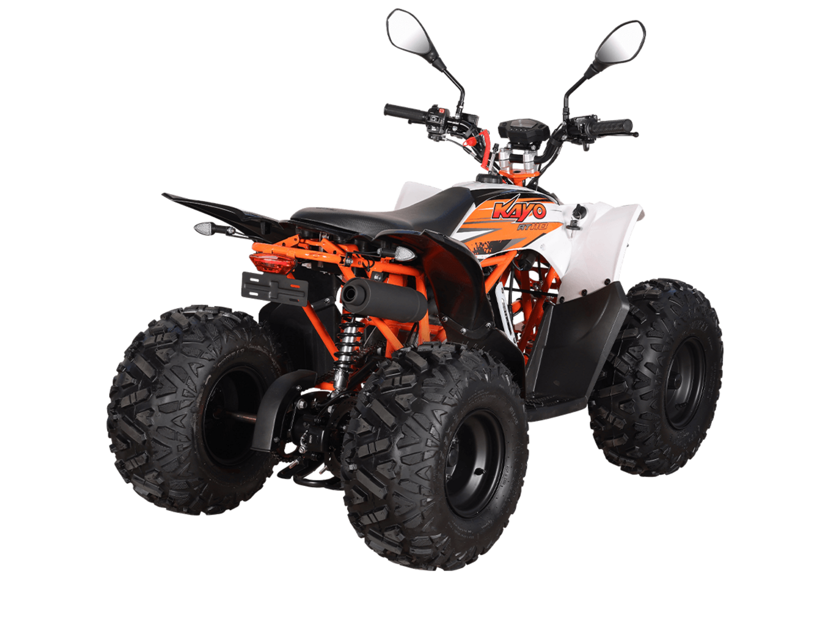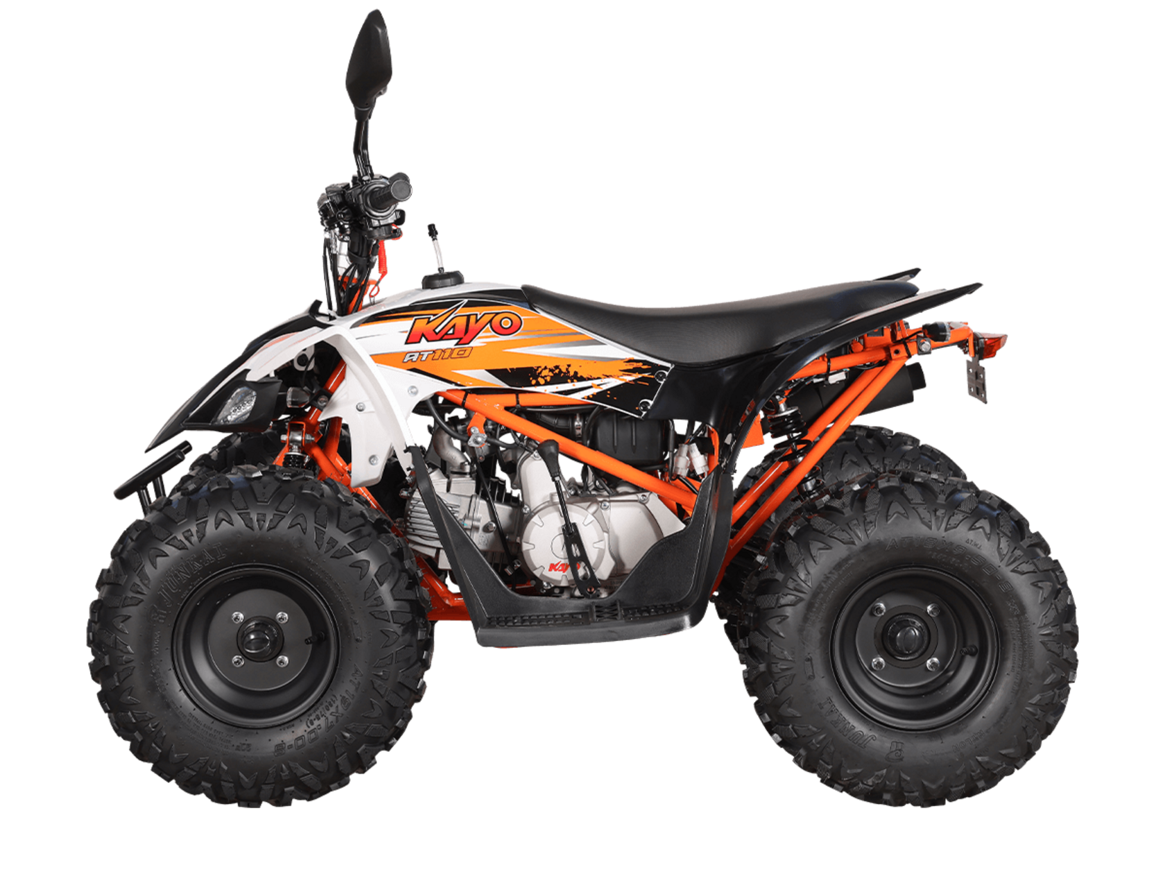 Квадрицикл KAYO AT110 – выносливая модель для освоения спортивной езды по бездорожью или помощи в хозяйстве. Хорошо подходит для детей и подростков, интересующихся поездками за пределами проторенных троп.Одноцилиндровый 4-тактный двигатель YX1P53FMH-2 с верхним распредвалом и воздушным охлаждением имеет объём 107 см3. Максимальная мощность 7,2 л.с. За подачу топлива отвечает карбюратор. Привод осуществляется на 2 колеса. Трансмиссия имеет автоматическую коробку передач со схемой F-N-R.Запуск осуществляется с помощью системы электронного зажигания. Имеется функция родительского дистанционного выключения двигателя.На квадрицикле используются колёса диаметром 8 дюймов. Амортизаторы подвески имеют длину 265 мм, задние можно регулировать. За торможение отвечает гидравлическая дисковая система. Клиренс составляет 110 мм, колёсная база 920 мм.Габариты модели 1360х840х880 мм, высота по седлу 660 мм, вес 98 кг. Ёмкость бака 4 литра.Наличие ПТС позволяет зарегистрировать технику на дорогах общего пользования.