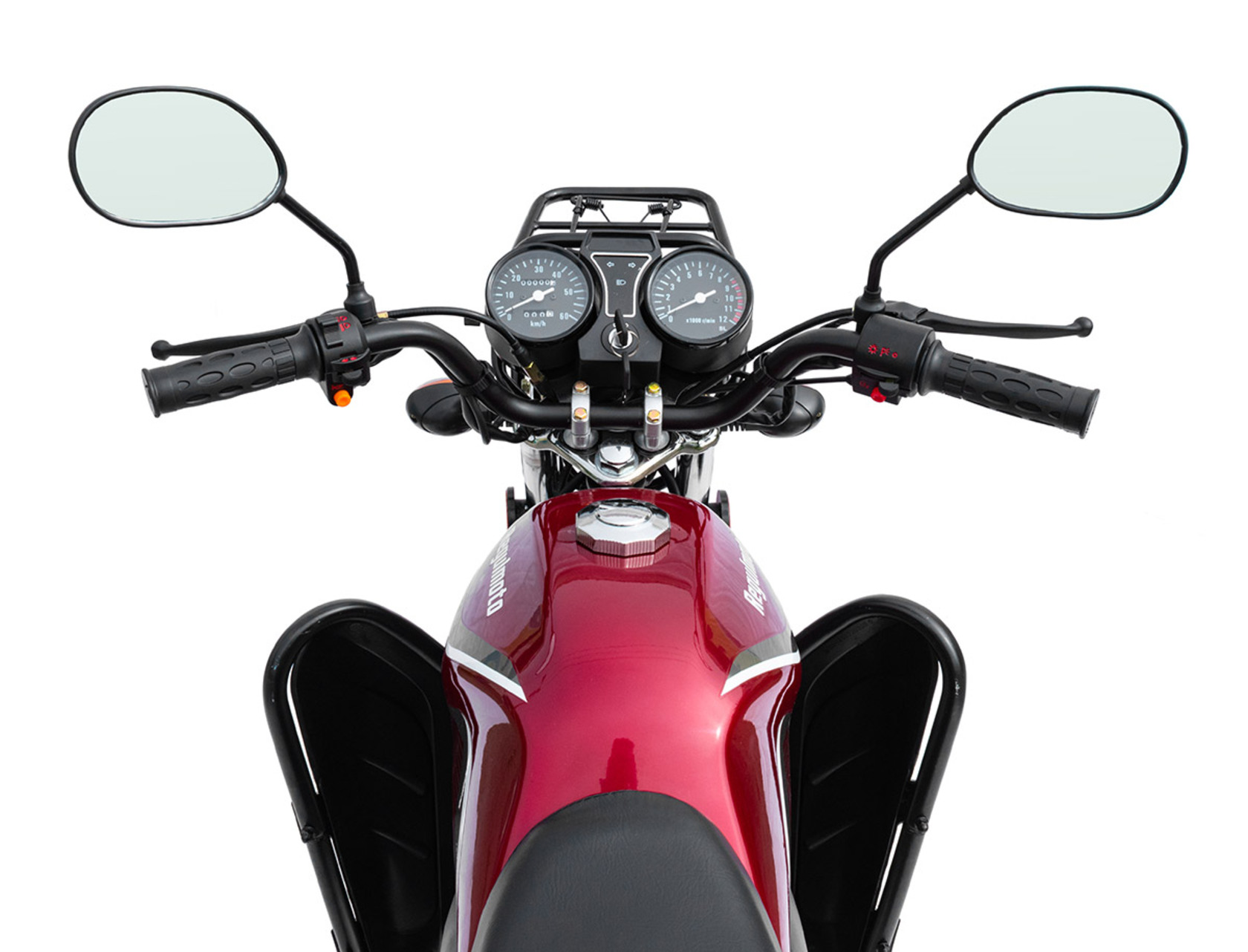 Комплектация Тормозная система – два барабанных тормоза. Усиленные тросы переднего тормоза и сцепления. Кроме того, на Regulmoto Alpha (RM-2) установлены зеркала заднего вида, подножки для пассажира, багажный кофр, пластиковые бардачки, кожух защиты цепи и дуги безопасности.