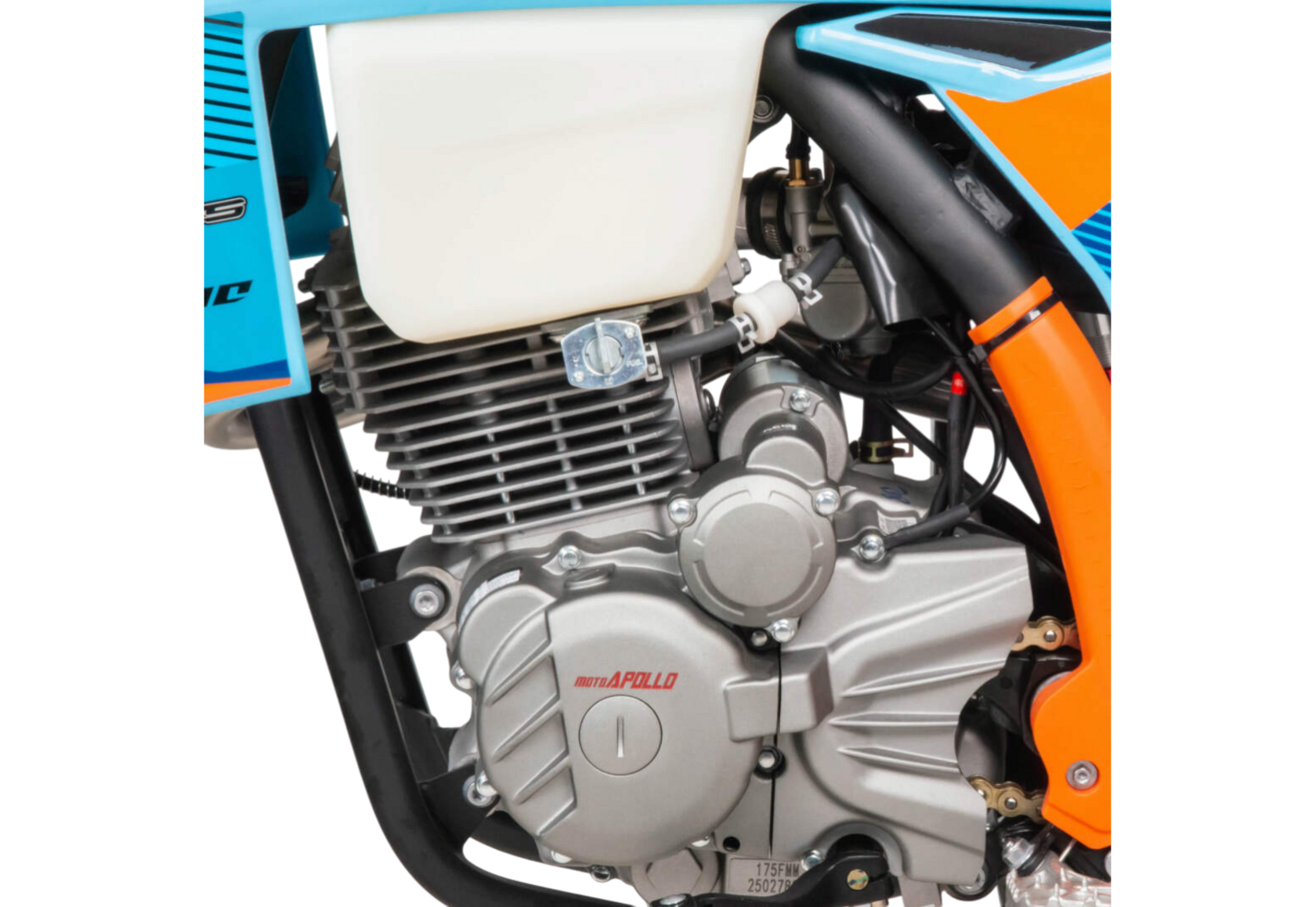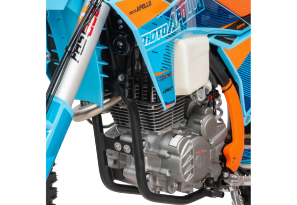 Moto Apollo F3 300 в этой версии — это сбалансированный кроссовый мотоцикл, разработанный для уверенной и динамичной езды по бездорожью. Несмотря на обозначение двигателя NB300F, его реальный рабочий объём составляет 300 см³, а максимальная мощность — 25 лошадиных сил. Воздушное охлаждение, цепной привод ГРМ и отсутствие балансирного вала обеспечивают классическую кроссовую простоту конструкции, лёгкость обслуживания и высокую ремонтопригодность даже в полевых условиях.